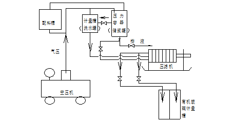 6.约5min后,检查所有阀门看是否已关紧?确保全部关紧后,待空压机气压达到0.8Mpa后,打开压力容器的进气阀,再打开空压机出口转换阀送气,同时注意控制压力容器的进气阀的开度,控制混合釜压力表的指示值在0.1MPa左右,并一直维持在恒压条件下操作,如果压力过大也可通过压力容器右侧的放空阀调节;