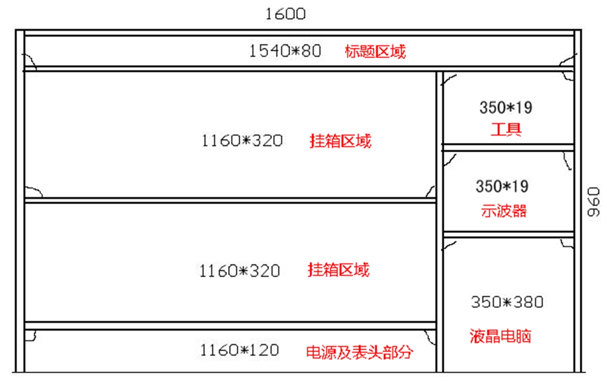 产品上部设计图,增加了液晶电脑与示波器工具放置位置,便于实验室的管理与使用。