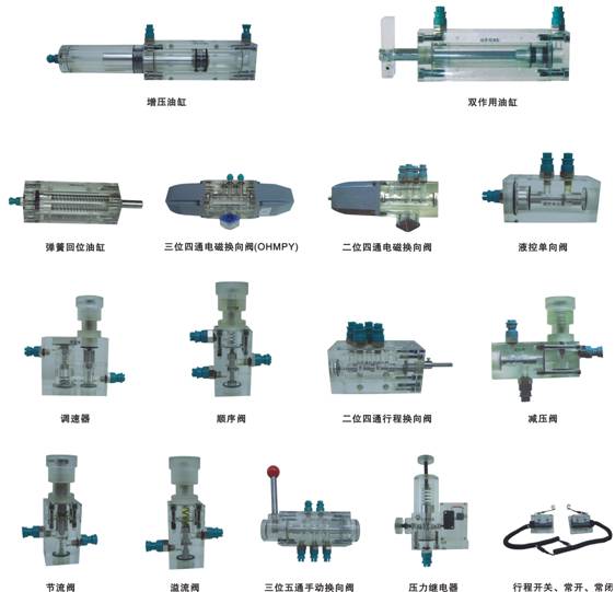 4、实训元件均为透明有机材料制成,便于了解掌握几十种常用液压元件的结构,性能及用途。掌握几十种基本回路的工作原理,实验组装回路快捷、方便。
